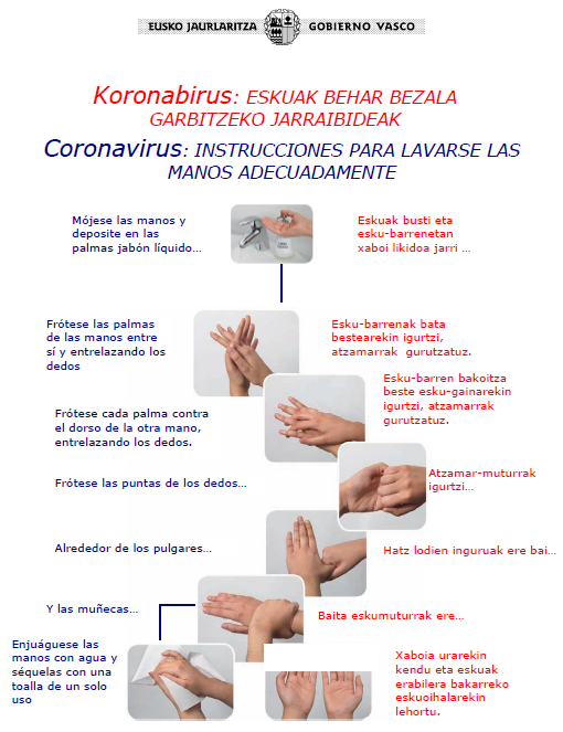 - Lavarse las manos a menudo con agua y jabón (o solución recomendada) para evitar la transmisión o el contacto con los virus y siempre después de toser, estornudar y sonarse. Si las manos están visiblemente limpias la higiene de manos se hará con productos de base alcohólica 🡪 Si estuvieran sucias o manchadas con fluidos se hará con agua y jabón antiséptico 🡪 LAVADO. Si no se dispone de productos en base alcohólica proceder siempre a un lavado de manos.