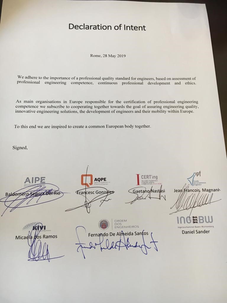 Los firmantes del acuerdo de intenciones fueron por pare de AIPE Baldomero Segura, Francesc González por AQPE, Gaetano Nastasi por parte Italia, Jean Francois Magnani por parte de Francia, por Holanda Micaela dos Ramos, Fernando de Almeida por Portugal, y Daniel Sander por parte de Ingenieurkammer BW.