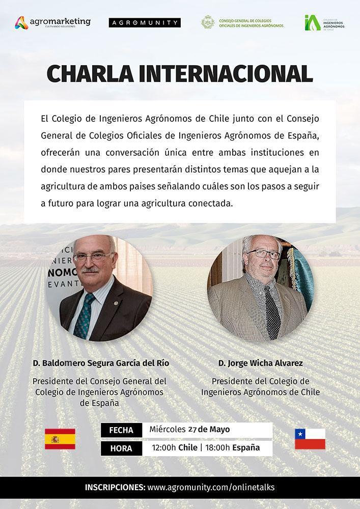 Agromunity ha organizado una charla entre el presidente del Colegio Ingenieros Agrónomos de Chile A.G, D. Jorge Wicha Álvarez, y el presidente del Consejo General de Colegios Oficiales de Ingenieros Agrónomos de España, D. Baldomero Segura García del Río