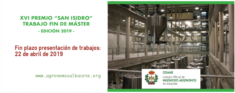El XVI PREMIO “SAN ISIDRO”, al MEJOR PROYECTO FIN DE MÁSTER presentado en la Escuela Técnica Superior de Ingenieros Agrónomos y de Montes de Albacete, ha recaído en D. Háctor Picazo Denia, ingeniero agrónomo, autor del XVI PREMIO SAN ISIDRO TRABAJO FIN DE MÁSTER. EDICIÓN 2019 al “ANÁLISIS DEL EFECTO DE DIFERENTES SISTEMAS DE RIEGO SOBRE EL RENDIMIENTO, LA EFICIENCIA EN EL USO DEL AGUA Y LA RENTABILIDAD DEL CULTIVO DEL MAÍZ GRANO (ZEA MAYS L.)”.