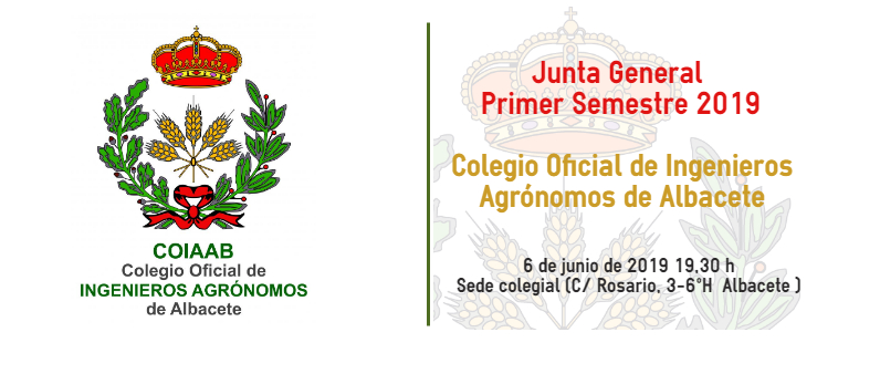 Por la presente se convoca a la Junta General Ordinaria a celebrar el día 6 (jueves) de junio de 2019, a las 19,00h. en primera convocatoria y a las 19,30h. en segunda convocatoria en la sede del Colegio en Albacete, con el siguiente