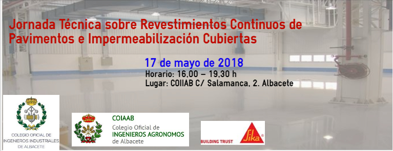 Los Colegios Oficiales de Ingenieros Agrónomos e Ingenieros Industriales de Albacete, en colaboración con SIKA, hemos organizado la JORNADA DE FORMACIÓN: REVESTIMIENTOS CONTINUOS DE PAVIMENTOS INDUSTRIALES e IMPERMEABILIZACIÓN DE CUBIERTAS DE INSTALACIONES INDUSTRIALES, con el siguiente