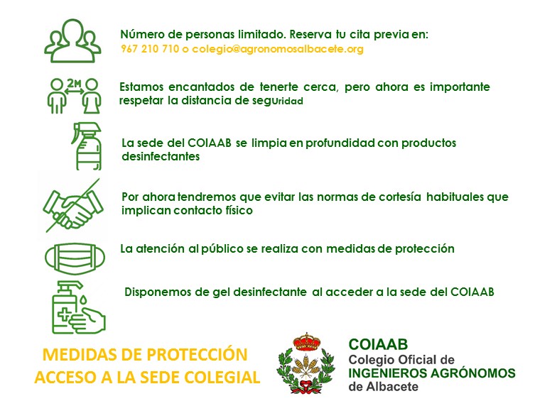Nos importa tu salud y seguridad, y la de nuestras empleadas, por lo que hemos establecido estas medidas de protección. Intenta evitar, en la medida de lo posible, acudir a la Sede del Colegio Oficial de Ingenieros Agrónomos de Albacete.