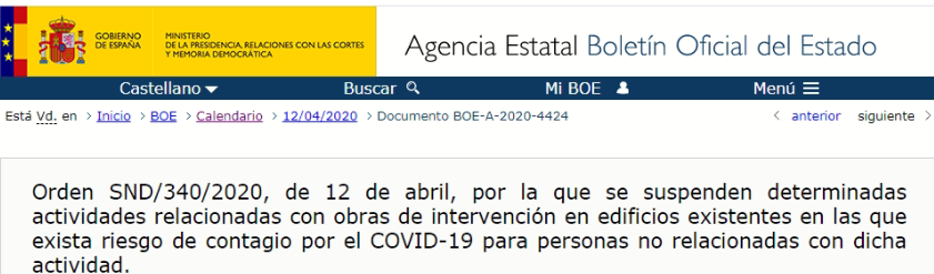 Pero, el Boletín Oficial del Estado nº 102 del 12 de abril, ha publicado la  Orden SND/340/2020, de 12 de abril, en la que se suspenden determinadas actividades relacionadas con obras de intervención en edificios existentes en las que exista riesgo de contagio por el COVID-19 para personas no relacionadas con dicha actividad