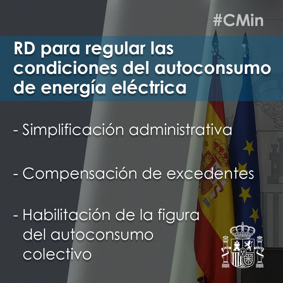 El Consejo de Ministros del día 5 de abril ha aprobado un Real Decreto por el que se regulan las condiciones administrativas, técnicas y económicas del autoconsumo en España. Esta norma completa el marco regulatorio sobre esta cuestión, impulsado por el Real Decreto-ley 15/2018 por el que se derogó el denominado impuesto al sol, y aporta certidumbre y seguridad a los usuarios. Entre otras medidas, el Real Decreto habilita la figura del autoconsumo colectivo, que fomentará esta fórmula en las comunidades de propietarios o en polígonos industriales; reduce los trámites administrativos, especialmente en el caso de los pequeños autoconsumidores, y establece un mecanismo simplificado de compensación de la energía autoproducida y no consumida.